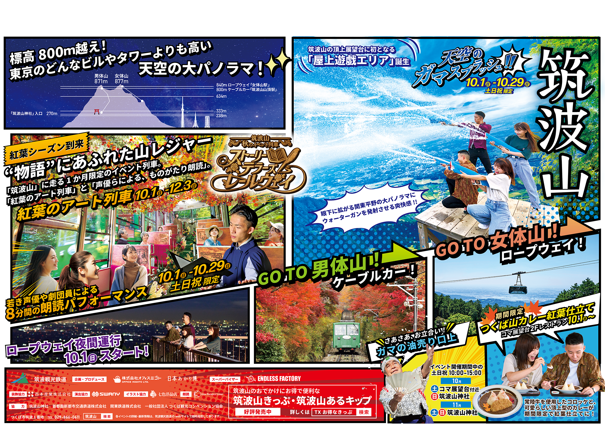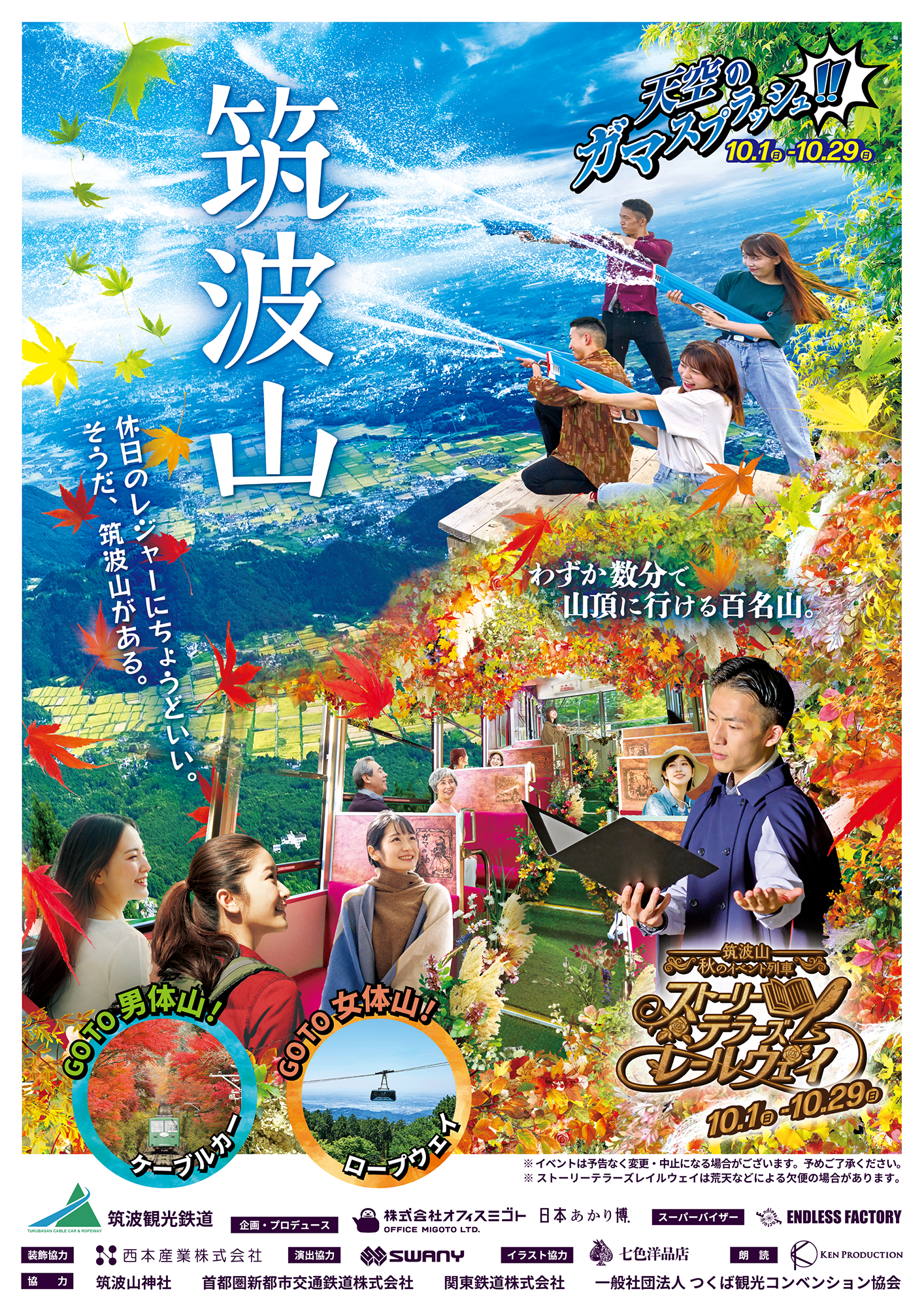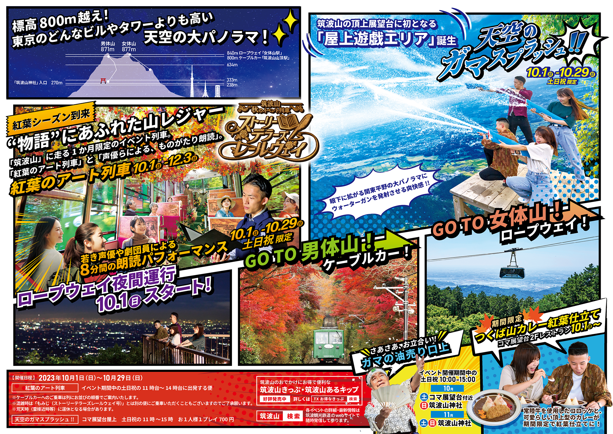 筑波観光鉄道(本社:茨城県つくば市、社長:枝村 誠)が運営する筑波山ケーブルカーでは、2023年10月1日(日)~10月29日(日)の期間、秋の山レジャー体験「ストーリーテラーズ レールウェイ×天空のガマスプラッシュ!!」を開催します。