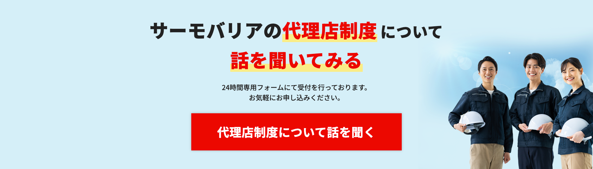 サーモバリアの取り扱いに興味のある企業様、少し話を聞いてみたいという企業様、まずは弊社の「代理店制度ページ」をご覧いただきたいです。