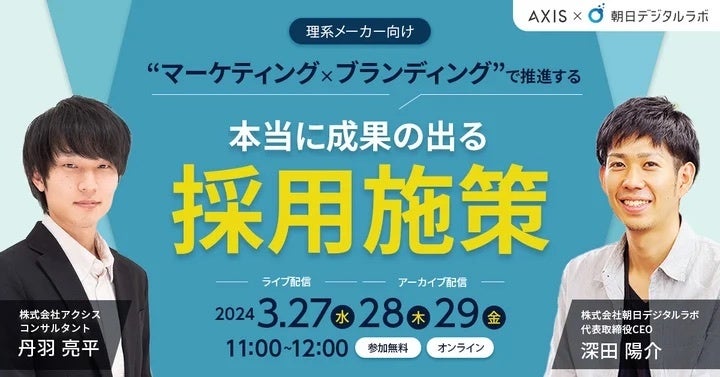 株式会社朝日デジタルラボ(東京都港区虎ノ門、代表取締役CEO:深田陽介、以下 朝日デジタルラボ)は、企業のWebマーケティング支援事業を展開する株式会社アクシス(岐阜県岐阜市、代表取締役:臼井教司、以下 アクシス)と共催オンラインセミナーを実施いたします。