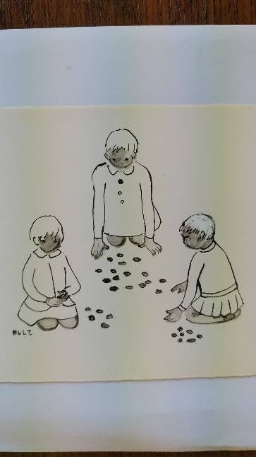 ご案内状は、中川李枝子さん・作、宗弥さん・絵の『ももいろのきりん』(福音館書店)の女の子・るるこ。大好きだったようで、たくさんの模写が見つかりました。