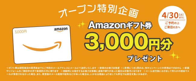 4月1日(月)~4月30日(火)の期間中に同店ご予約のうえご利用のお客様にAmazonギフト券3000円分をプレゼント。