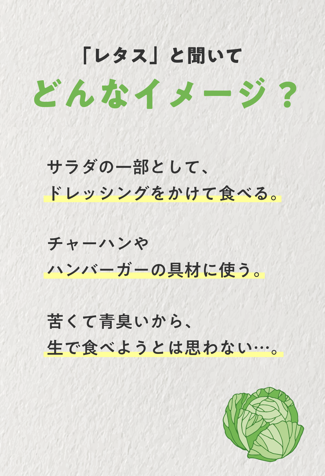 ・皆さんは、「レタス」と聞いてどんなイメージを思い浮かべますか?