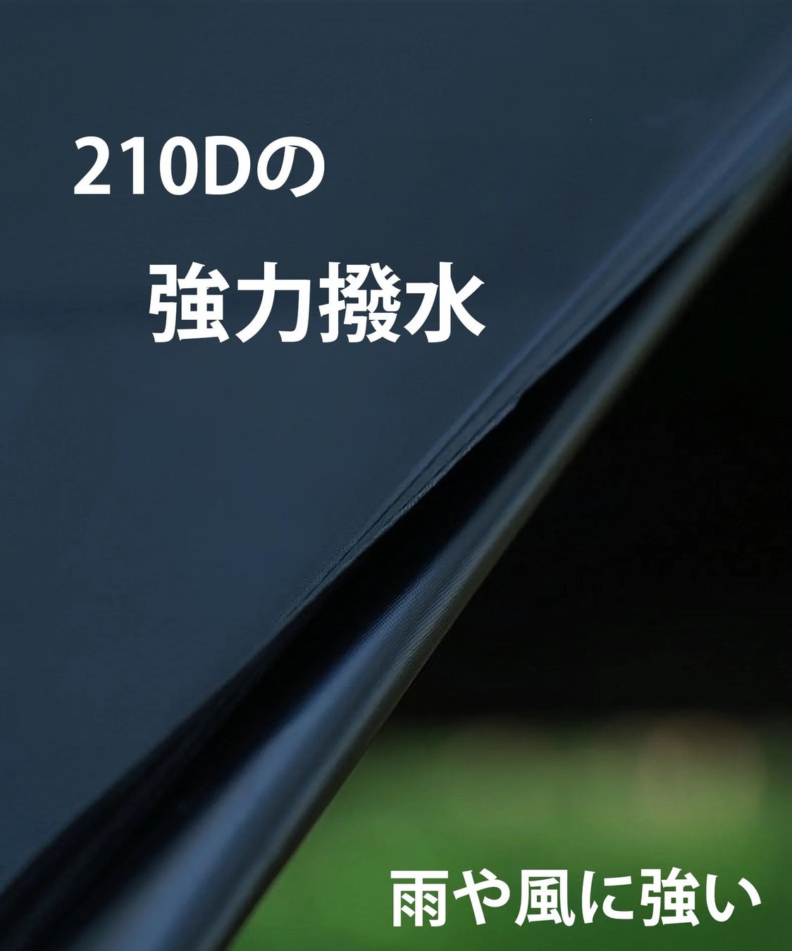 キャンプ用のテントでは68D、75D、150D、210Dなどが主流です。本製品は、非常に高い耐久性と撥水性を有する210Dのオックスフォード素材で作られております。