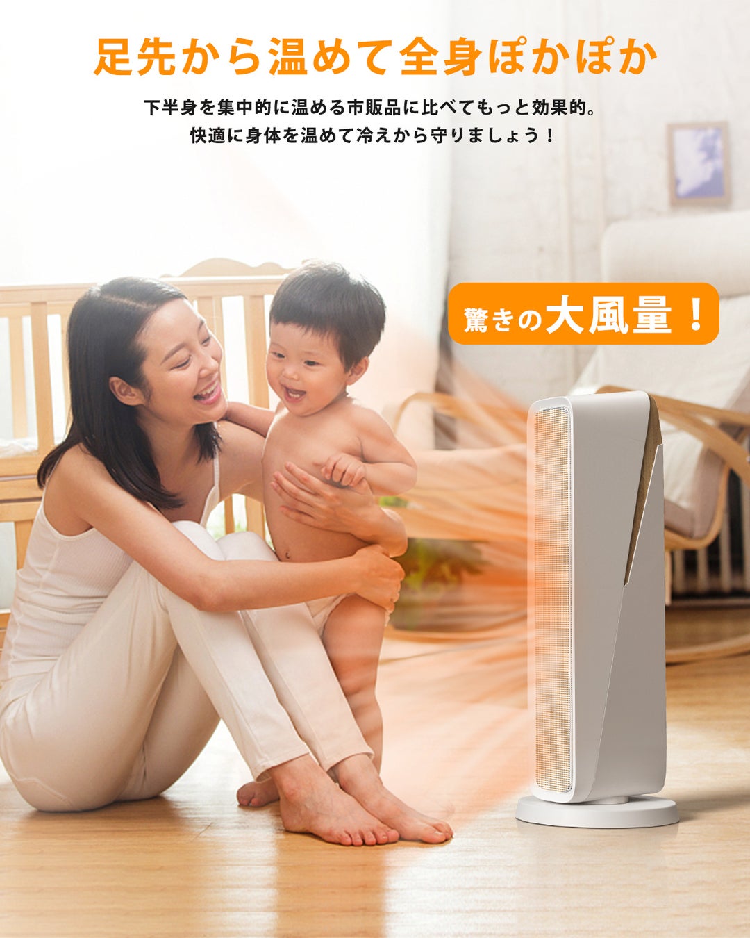 持ち運びしやすいサイズ感と軽さに加え、リモコン付き、首振り・タイマー・節電機能など、使い勝手のよさを備えている点が魅力です。チャイルドロックもついた安全設計のため小さな子ども・ペットがいる家庭にもぴったり。