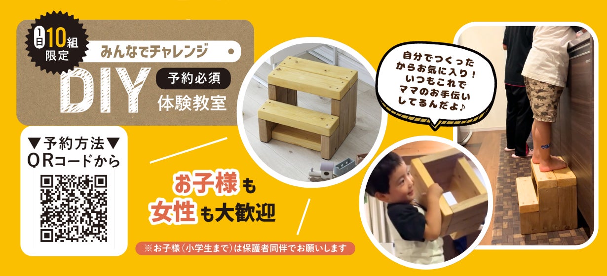 家具作り体験ができるDIY教室や、ガッツリ系からデザートまで楽しめるキッチンカーの出店!お菓子の詰め放題などお子様から大人まで楽しめるイベントも盛りだくさんです!