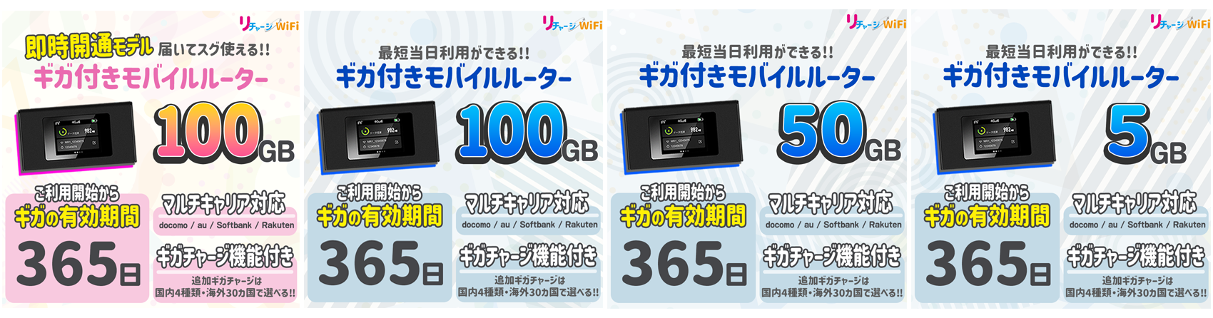 楽天では、大人気商品【即時開通モデル】を始めとした、ギガつきモバイルルーターの4種類をラインナップしております。