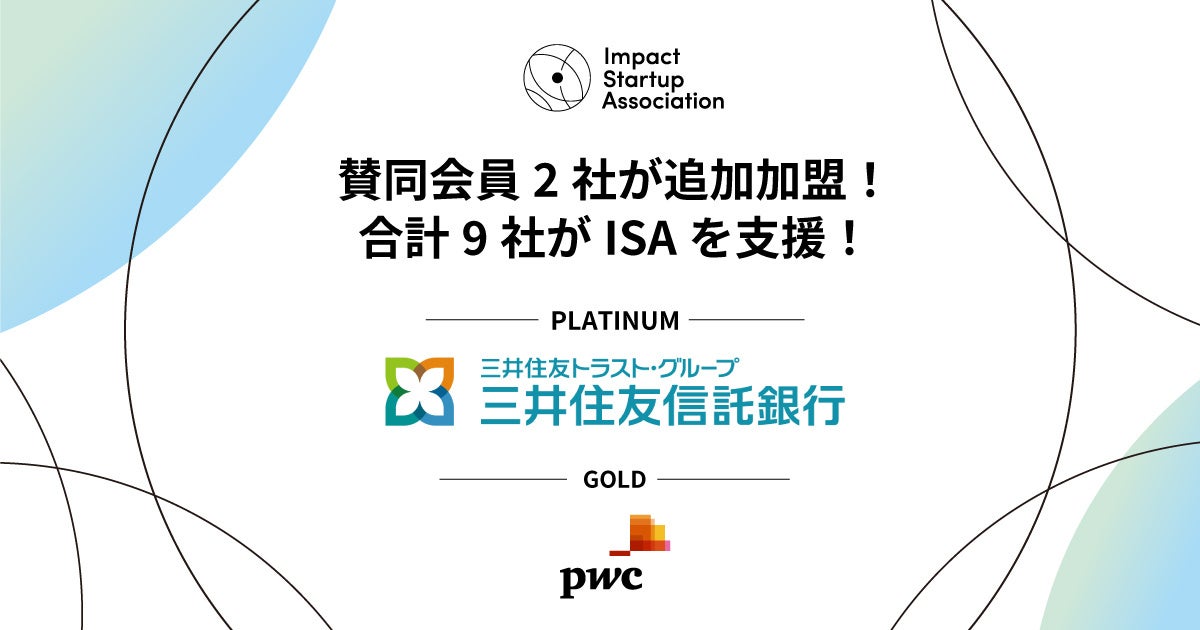 一般社団法人インパクトスタートアップ協会(Impact Startup Association、以下「ISA」)に、三井住友信託銀行株式会社、PwC Japan グループが第1期賛同会員に追加加盟いたしました。