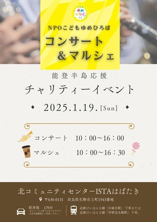 1/19(日)【チャリティーコンサート&マルシェ】奈良の北コミュニティセンターISTAはばたきで能登半島地震の支援イベントを開催