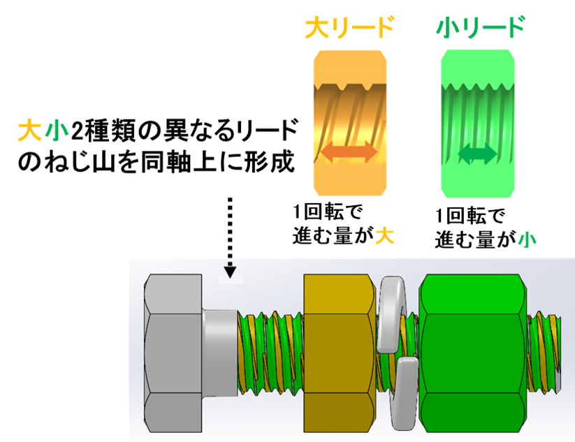 ・1本のボルトに大小2種の異なるリードのねじ山を有し、各々に対応するダブルナット方式の締結体です。