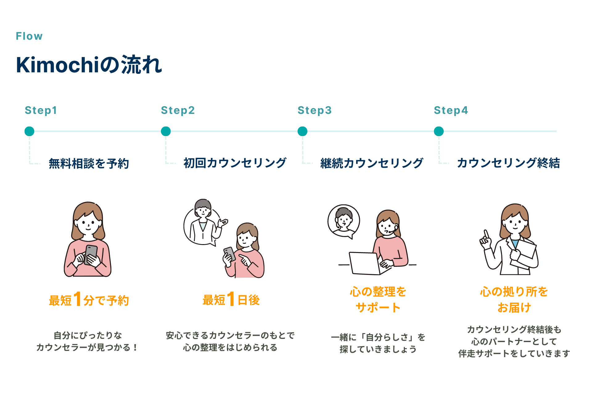 「Kimochi」はカウンセリングのハードルを下げるために安心して開始できる取り組みを積極的に行っています。