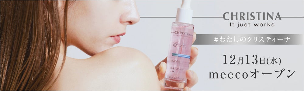 ポップアップ初日の12月13日(水)午前10時より、クリスティーナアイテムを三越伊勢丹オンラインストア「meeco」にて今回店頭にてご紹介するアイテムの一部を購入可能です。meecoでは、カウンセリングが必要となるサロン専売品は購入できないためご注意ください。