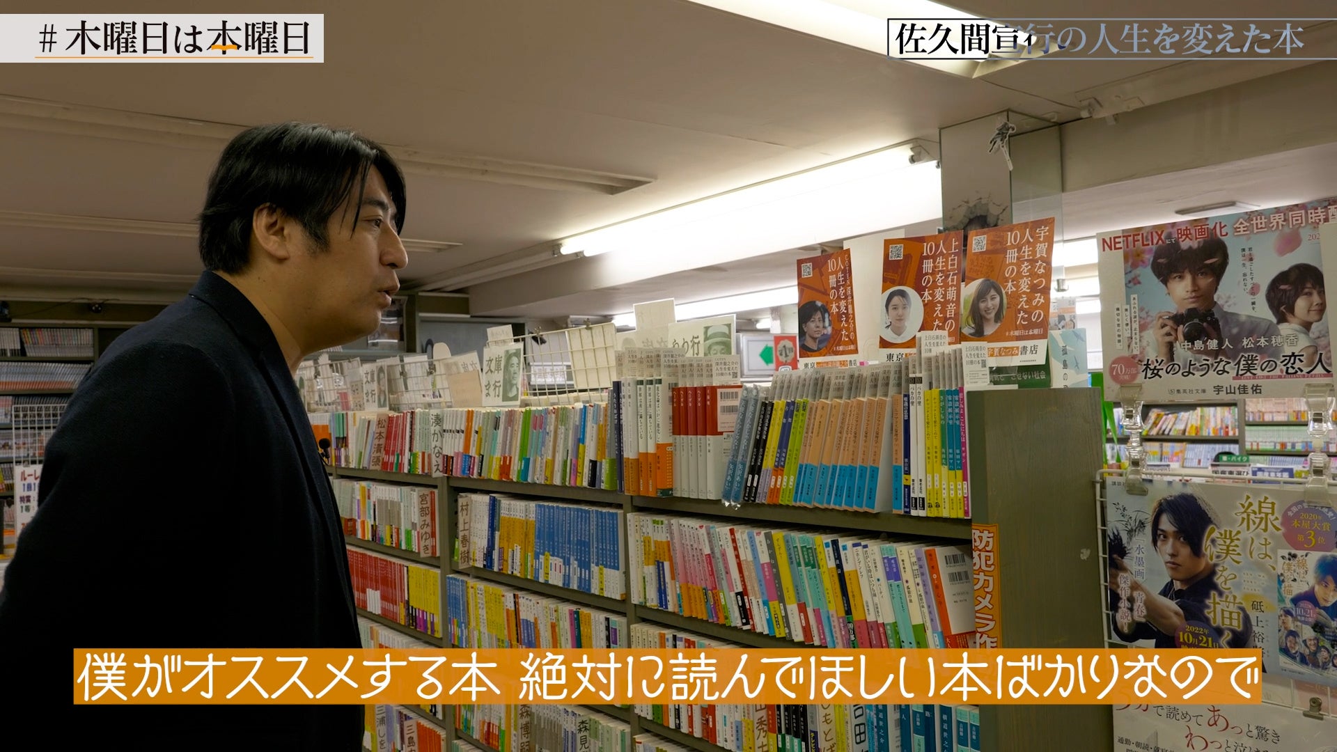「#木曜日は本曜日」プロジェクト第5弾では、テレビプロデューサーとして活躍されている佐久間宣行さんにご協力いただきました。動画前半では、佐久間さんが「人生を変えた本」として選書いただいた10冊の中から、佐久間さんが小さなころから何度も買い直して読み続けている本や、ご自身がプロデュースされている番組にも出演中のオードリー 若林正恭さんのエッセイの魅力などについてお話しいただきました。動画後半では佐久間さんがAD時代から通っていたという崇文堂書店(東京都港区)を訪れ、街の人々から愛される老舗の本屋の魅力などをお話しいただきました。本動画は特設サイトおよび東京都書店商業組合公式YouTubeチャンネル「東京の本屋さん~街に本屋があるということ~」にて本日11月3日(木)より公開いたします。