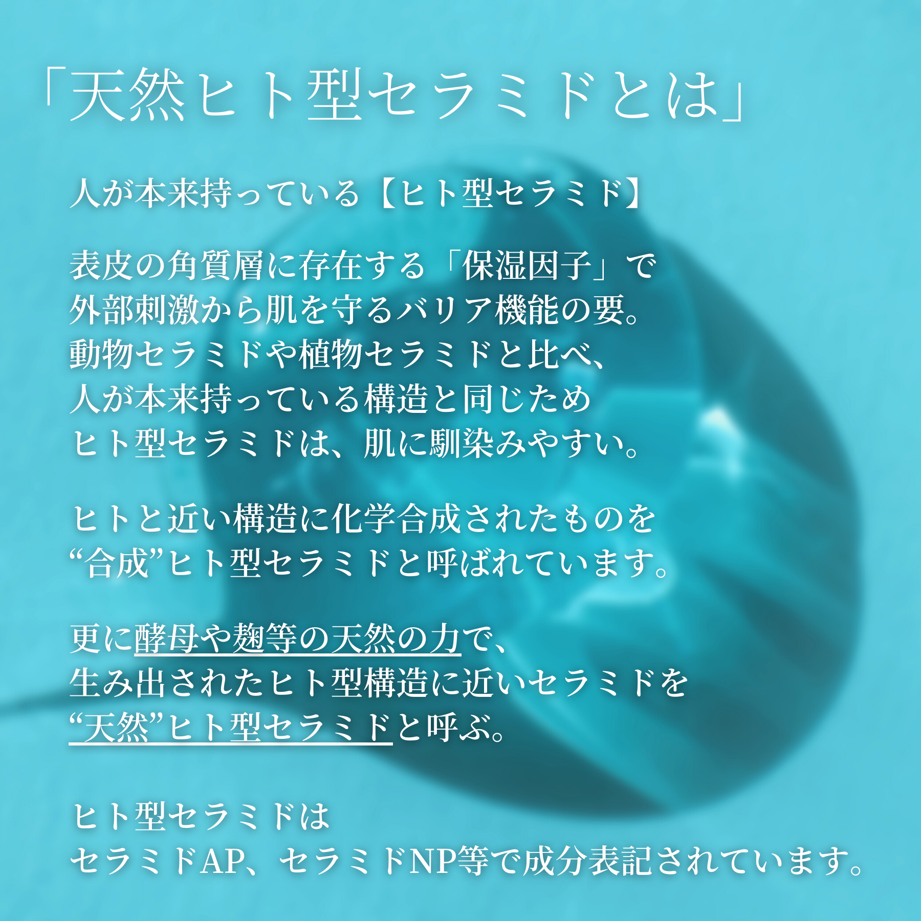 化学物質ではなく、天然の醸造発酵粕から精製した、世界初のセラミド「天然ヒト型セラミド」を配合しています。 お醤油を作った際に使い粕として残った粕を高純度で抽出したのが 「天然ヒト型セラミド」です。