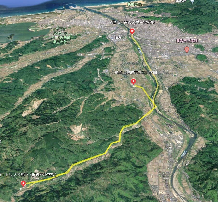 1.A地点 鳥取市千代川河川敷(古市スポーツ広場)~B地点 トリノス神戸(旧神戸小学校)
