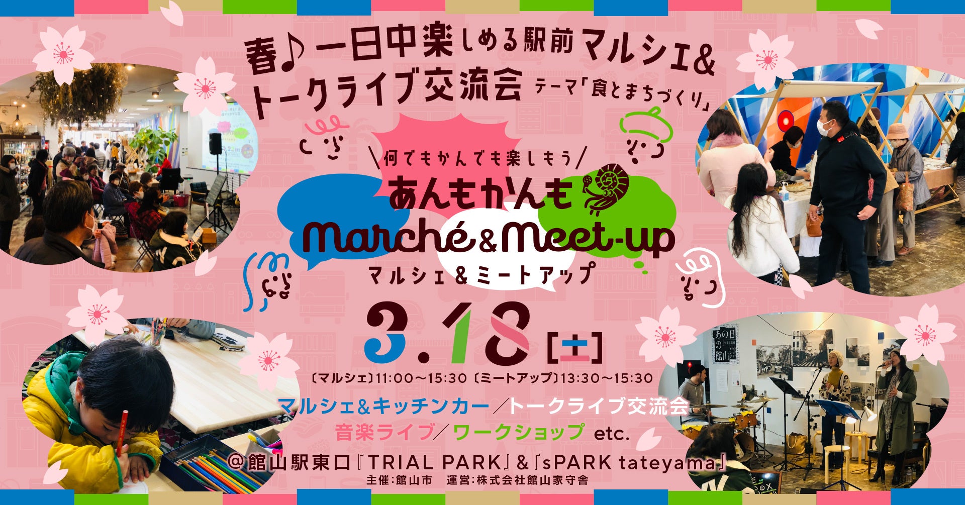 株式会社館山家守舎(たてやまやもりしゃ。本社:千葉県館山市、共同代表 本間 裕二・漆原 秀。以下、当社。)は館山市から受託した令和4年度館山リノベーションまちづくり事業の最終回として、2023年3月18日(土)、館山駅東口駅前に昨年秋に新しく誕生したパブリックスペース "sPARK tateyama" を活用し、地域グルメや音楽、そしてスポーツが楽しめる「あんもかんもMarché&MeetーUp」を開催する。