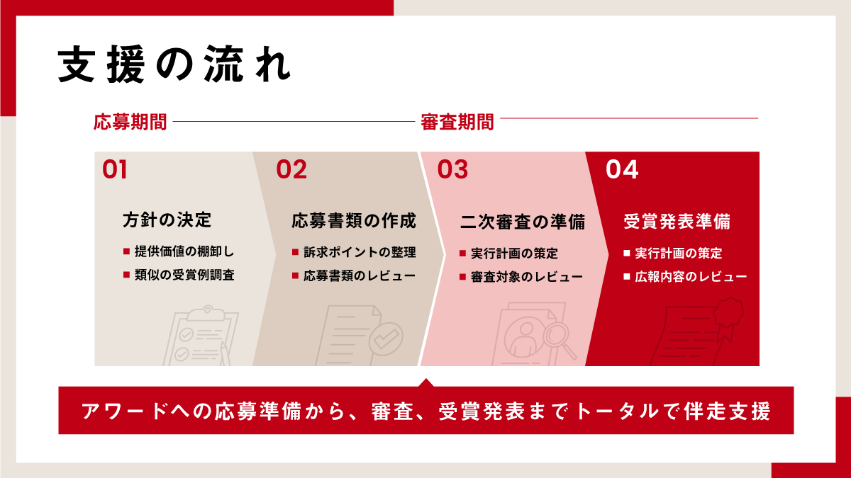 そこで、多数のアワード受賞実績があり、審査対応ノウハウや受賞によるプロモーション効果に関する知見を有するプロデューサーが伴走支援する「Award Booster(アワードブースター)」の提供を開始しました。