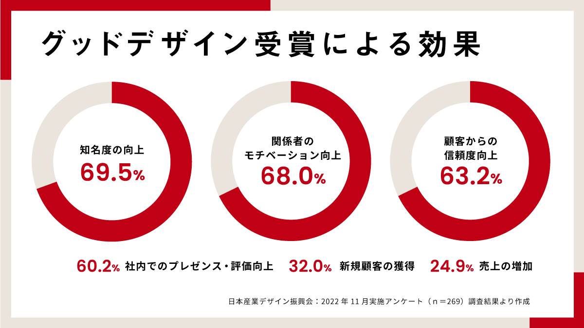 日本のデザイン界において最も権威のある賞の一つであるため、受賞することで製品やサービスの評価が高まり、競合との差別化を図れます。専門家である審査員からの評価コメントによる、信頼性の向上も見込めます。