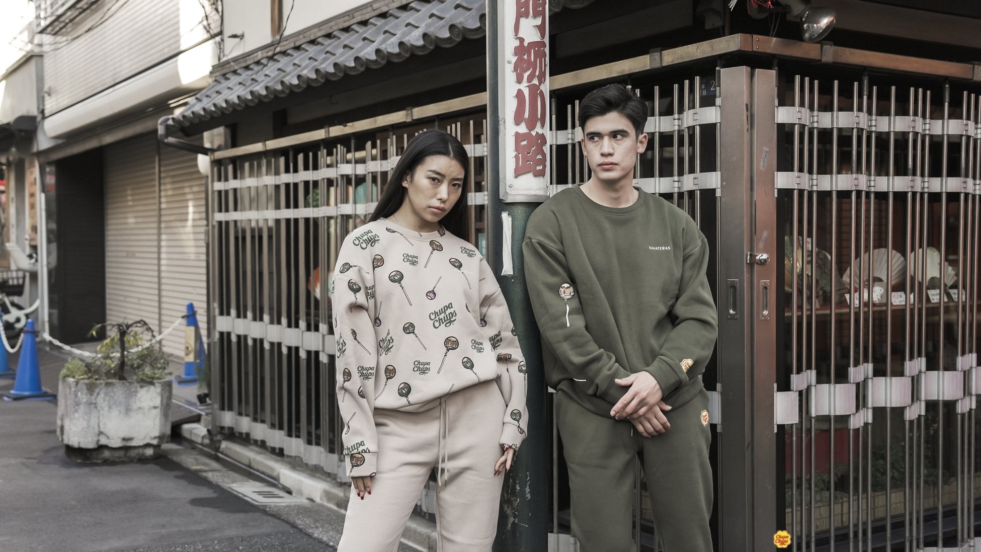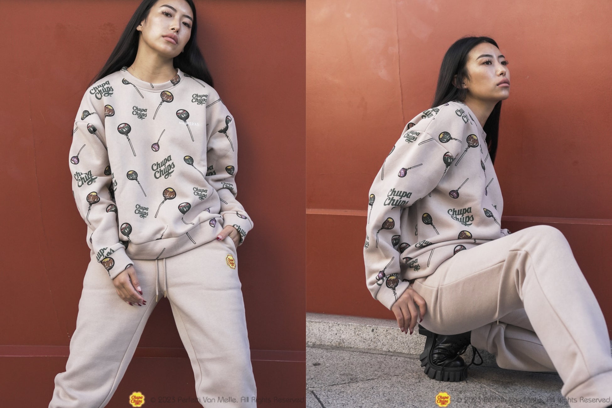 AMATERASの定番アイテムであるトラックスーツにChupa Chupsのロゴマーク、パッケージデザインを加え、どこか懐かしさを感じるデザイン。