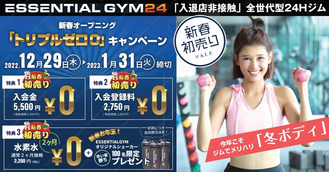 24時間フィットネスクラブを展開する、株式会社エイチアンドワイフィットネス (本社:文京区大塚 代表取締役:宇田川洋平、以下 当社)は、Withコロナ時代を踏まえた「入退店非接触」全世代型「新しいタイプの完全会員制24時間フィットネスクラブ」ESSENTIAL GYM24 茗荷谷店 「初売り!トリプル0ゼロ入会キャンペーン」を期間限定リリースいたします。