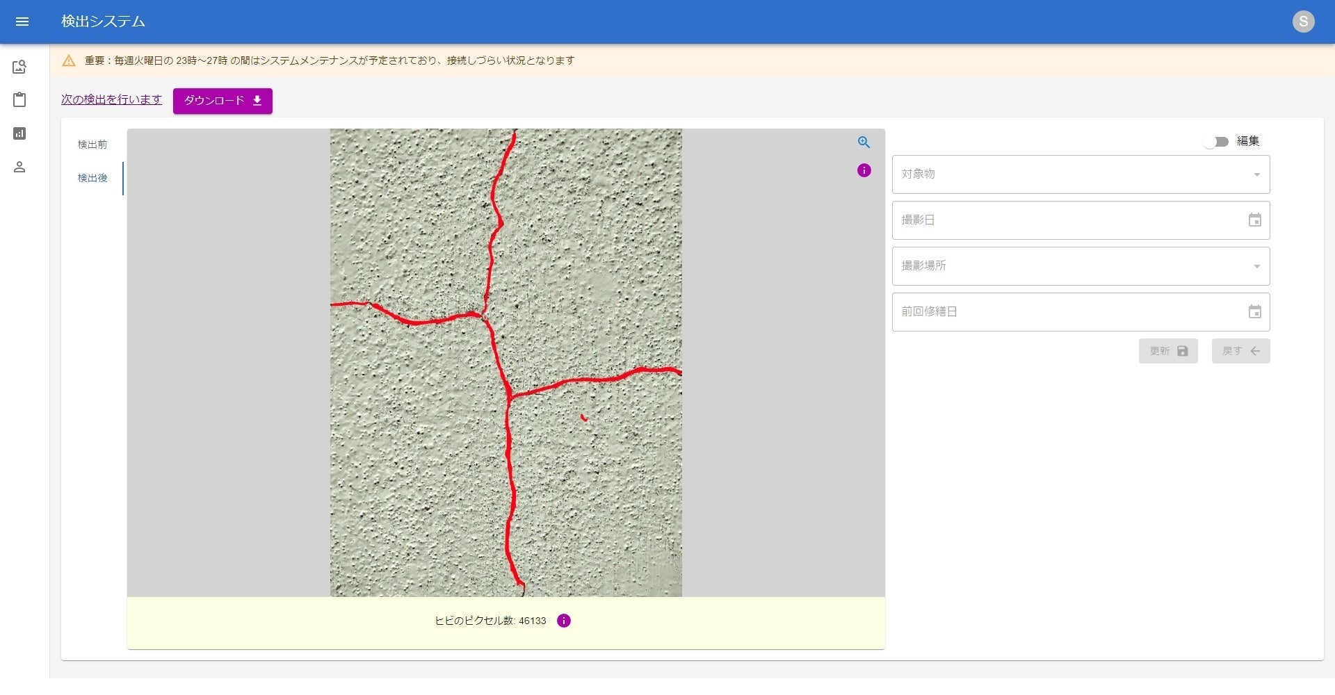 ヒビの長さをピクセル数によりカウントする事で、修繕の必要可否判断の一つの目安としてご利用頂けます。