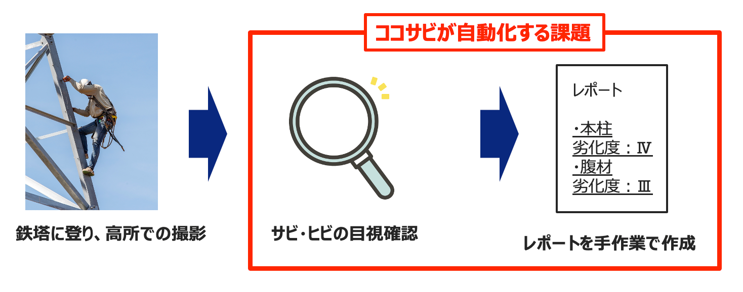 従来、施設・設備点検は、(1)高所に人が登って撮影を行い、(2)サビ・ヒビ等の状態を目視で確認し、(3)レポートを手作業で作成しており、高所作業からレポート作成までに多くの手間がかかっていました。