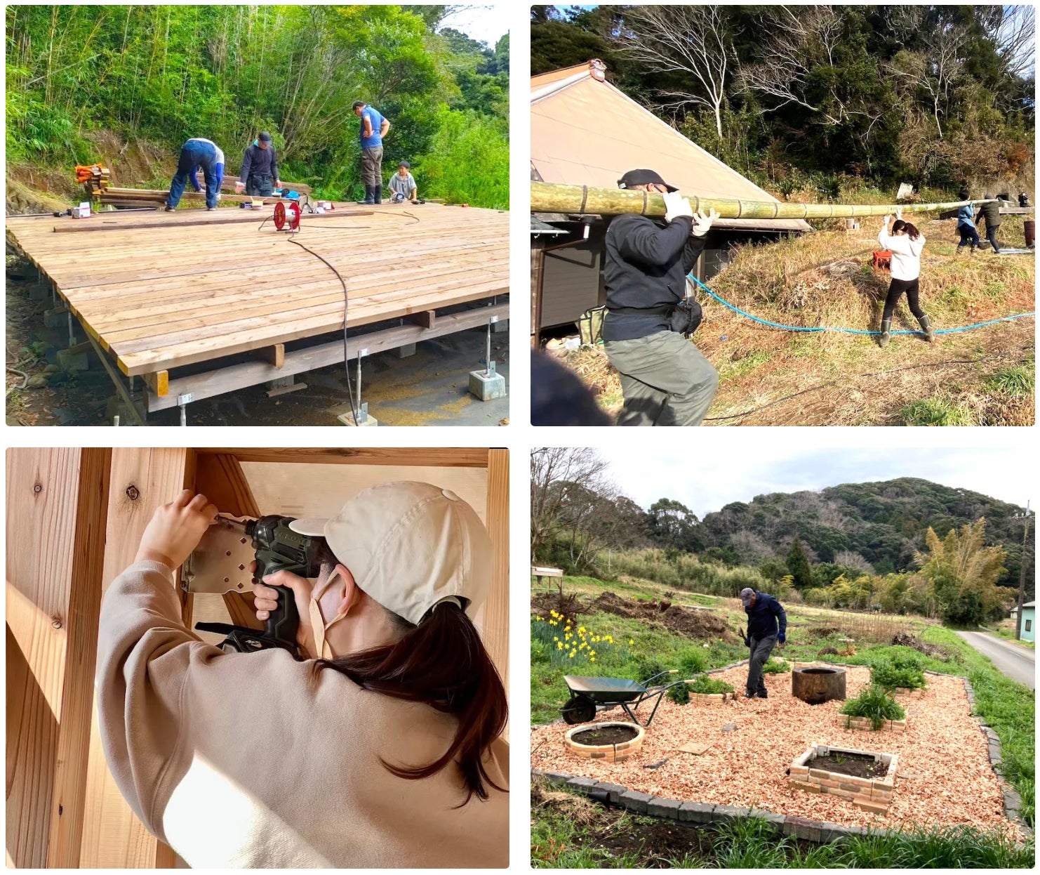 - 自然の中で、自らの手で何かを作り上げる喜びを体験します。初心者から経験者まで楽しめるプログラムで、竹を使ったガーデンフェンス作りやウッドデッキのDIYに挑戦します。