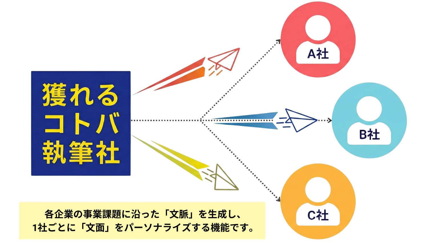 AIにすべてを委ねるのではなく、獲れるコトバ執筆社ならではのセールスライティング実践知を軸に、見込み顧客ごとに異なる需要のニュアンスを読み取り、その内容を意図的に指定した適切な挿入箇所へ反映する設計としています。
