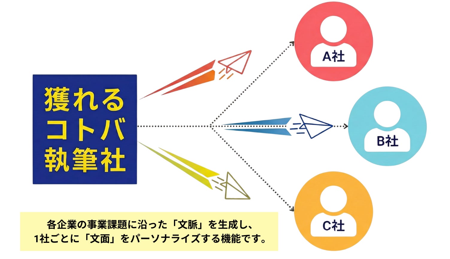 本機能は、獲れるコトバ執筆社が7年間にわたり培ってきたセールスライティングの知見を中核に、当社が保有する約500万社の企業データベースとクライアントのサービス情報をAIで組み合わせ、親和性の高い文脈を生成します。
