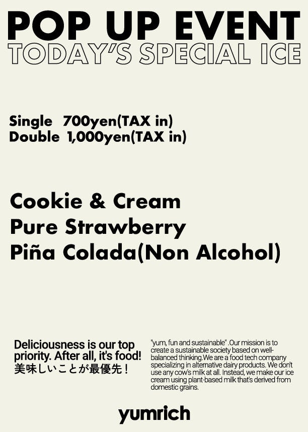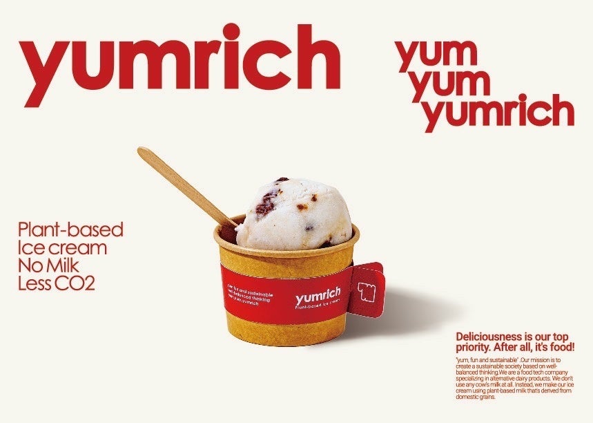 ヤムリッチは、従来のプラントベースやヴィーガンフードとは異なり、健康や環境への配慮だけでなく、食としての美味しさと楽しさを第一に追求するブランドです。「yum, fun, and sustainable.(美味しく、楽しく、サステナブルに。)」をスローガンに掲げています。牛乳は一切使用せず、国産の穀物をベースとした植物性ミルクを使用してプラントベースのアイスクリームを作っています。