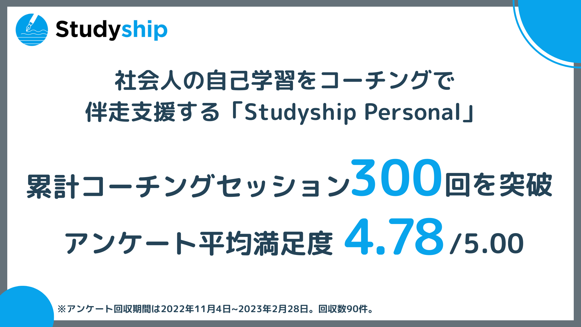 社会人のリスキリングをコーチングで支援する「Studyship」、累計コーチング回数が300回を突破!