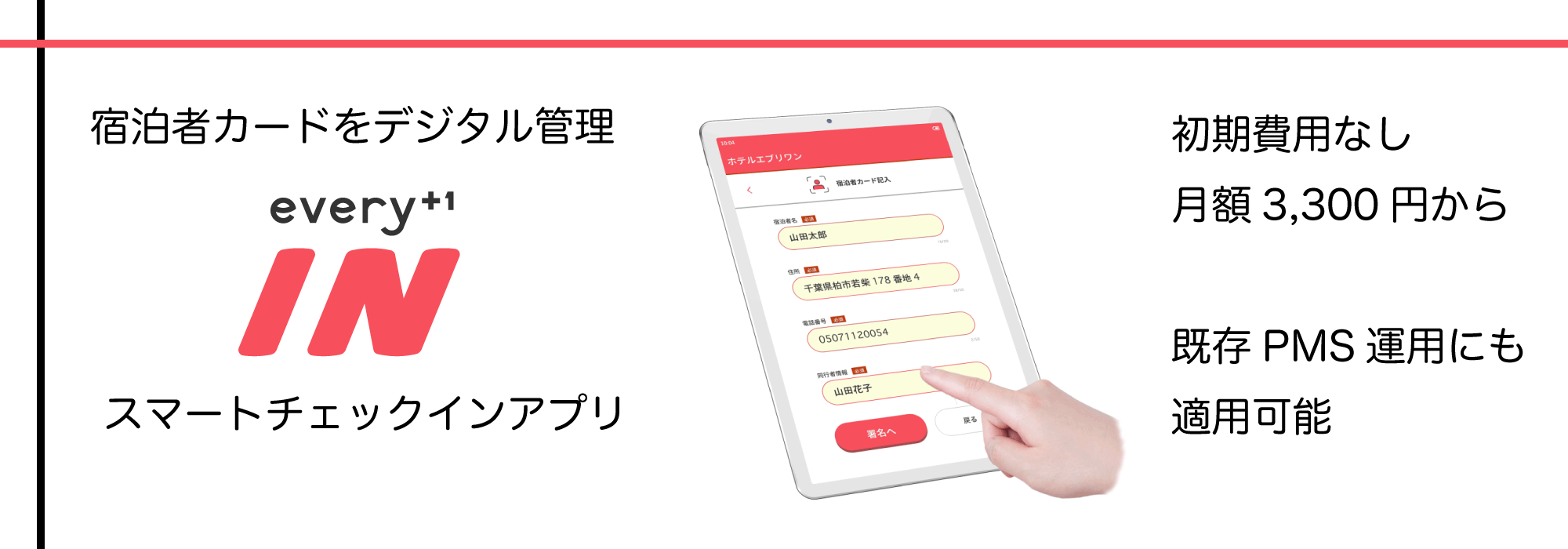 弊社PMSアプリevery+1(エブリワン)との連携で予約情報と紐付けはもちろんですが、既存利用の他社製PMSでも、紙の宿泊カードに変わり運用いただけます。