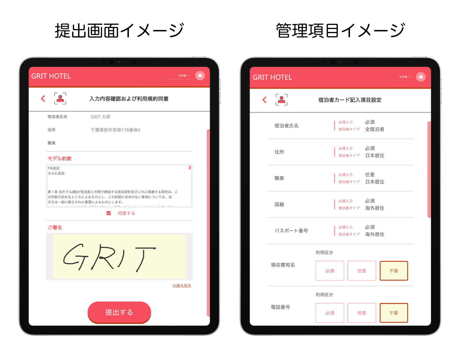 every+1 IN(エブリイン)では、アプリ内で宿泊カードを全てデジタル管理し、法令の必須事項はもちろんの事、Mailや領収書などのその他事項も必須や任意に設定が可能。