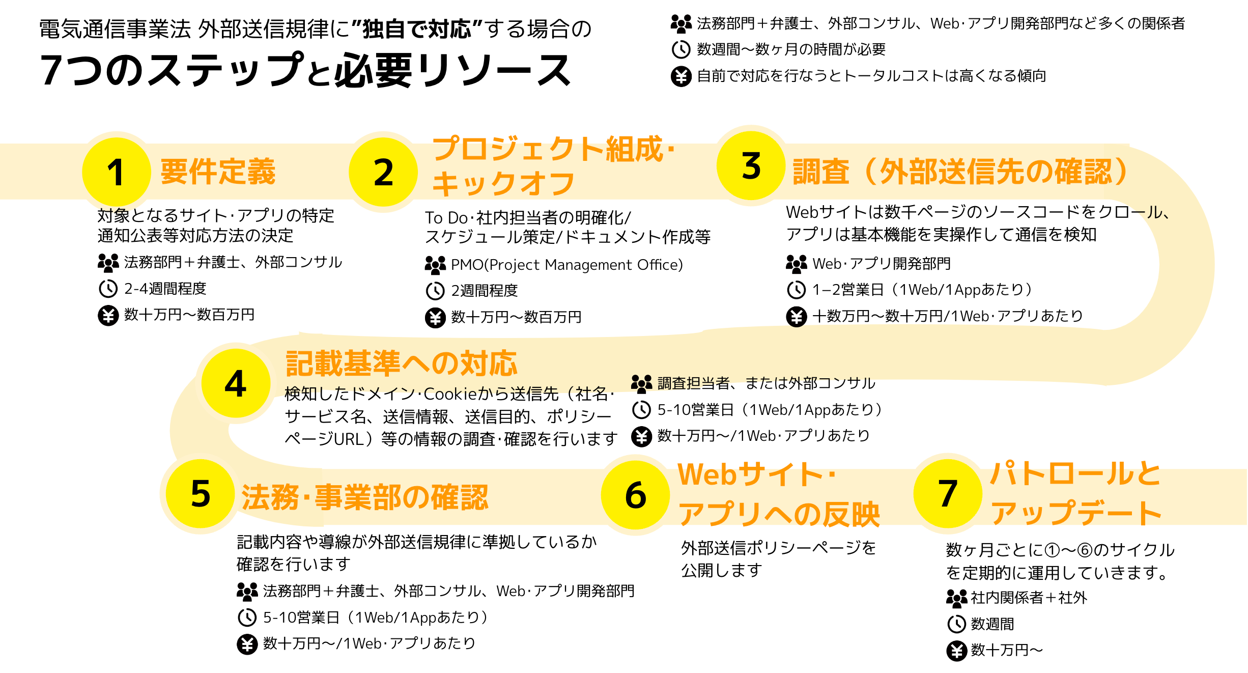 外部送信規律への対応は要件定義からWebサイト・アプリへの反映、定期的なパトロール・アップデートまで、主に7つのプロセスを必要とします。