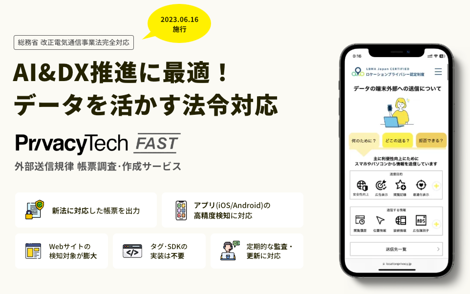 【改正電通法・外部送信規律施行直前!】<AI活用・DX推進企業向け>アプリ・Webの公表対応サービス「PrivacyTechFAST」正式リリース《先着10社限定!1ドメイン20万円で対応可能!》