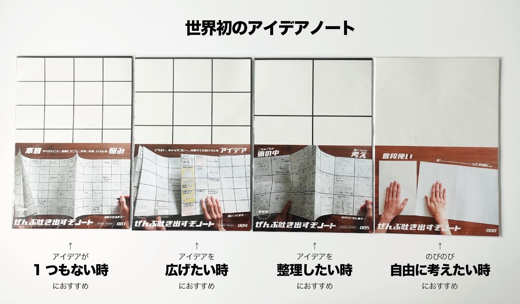 「ぜんぶ吐き出すぞノート」は、新しい答え(アイデア)を見つける目的で、頭の中をぜんぶ吐き出していく思考法に最適な発想ノートで、発想法株式会社(本社:東京都港区、代表取締役社長:黄 慶浩)が開発しました。これまではECサイトのみでの販売を行っていましたが、より多くの方に手に取っていただくため店頭での販売を目指しています。日本中にこのノートが広まり、そして世界中に広まることで「考えにくい」が無くせる日が来ることを夢見ています。