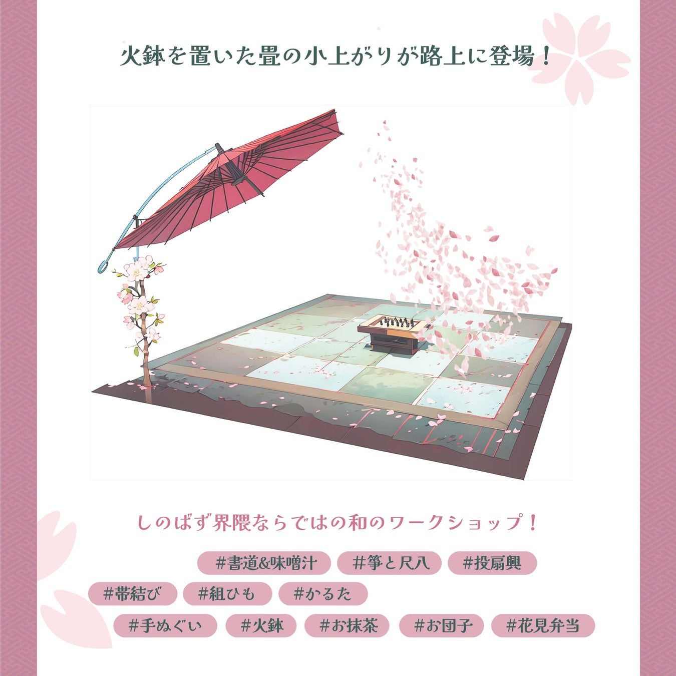不忍池の桜を眺めながら、畳の敷かれた小上がりで火鉢を囲む。東京上野・不忍通りの路上で、そんな新しい体験が楽しめる。開催日は2024年3月23日、24日、30日、31日の週末4日間。「桜日和の和めぐり広場」と題して、界隈ならではの食とワークショップの空間が設えられる。