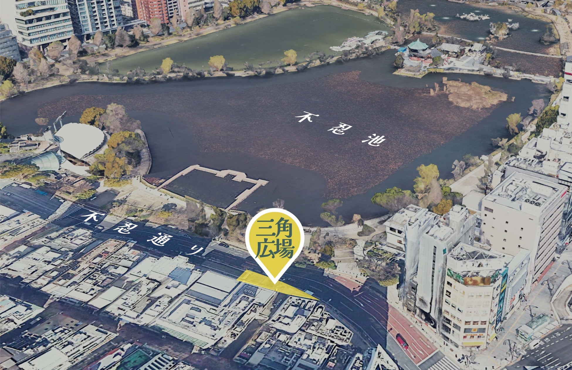 不忍通り三角広場(十三や櫛店、伊豆榮本店前)