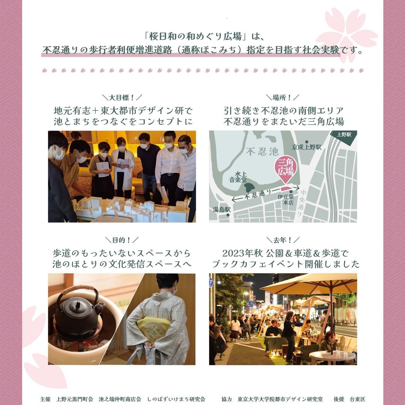 地元は、兼ねてから今回会場となる歩道の余地空間が、日常的に賑わいや文化情報発信の拠点になっていくことを期待している。「桜日和の和めぐり広場」は、「不忍通りほこみち社会実験2024年春」を兼ねており、2020年に創設されたばかりの新制度「歩行者利便増進道路(通称:ほこみち)」の指定を目指した取り組みとなっている。ほこみち制度は、地域を豊かにする歩行者中心の道路空間の構築を目指すもので、指定を受けた所定の区域では、今までより柔軟な道路占用が可能となる。不忍通りでは昨年秋にも「不忍通り“三角広場”日替りブックカフェ」がほこみち社会実験として開催されており、今回が2度目の実験となる。