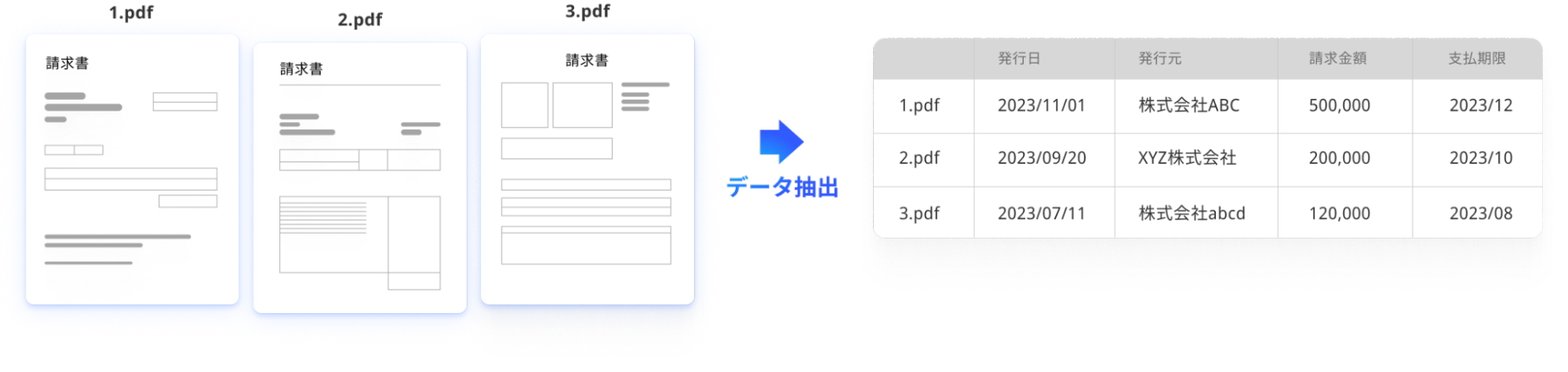 ロボオペレータAI 文書読み取りとは、「アップロードされた複数文書ファイルから、ユーザーが指定した項目を抽出する」データ抽出ソフトウェアです。