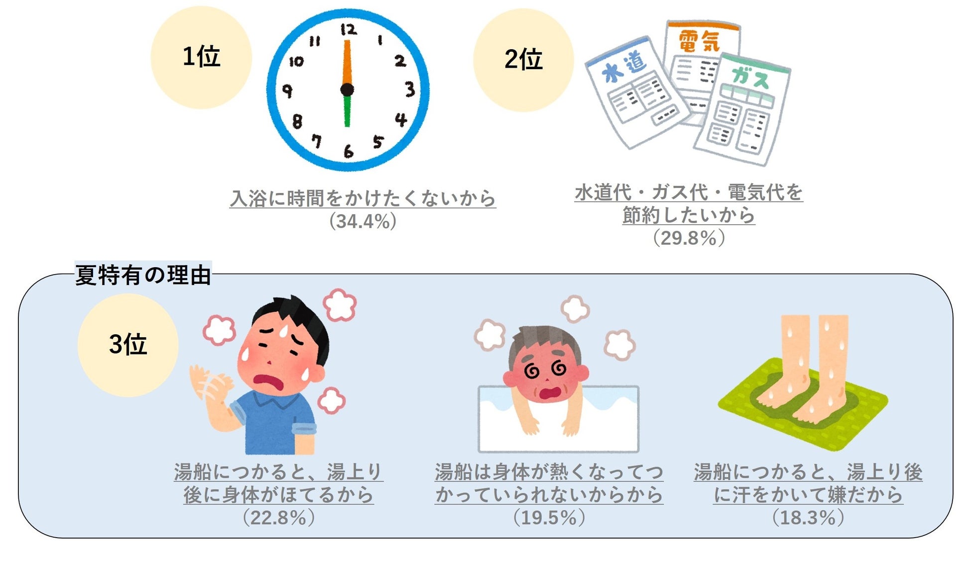 夏場特有の理由として、「湯船につかると、湯上り後に汗をかいて嫌だから」(22.8%)、「湯船は身体が熱くなってつかっていられないから」(19.5%)、「湯船につかると、湯上り後に身体がほてるから」(18.3%)など、夏の暑さの中で熱い湯船につかることを避けている人が多いことも分かりました。