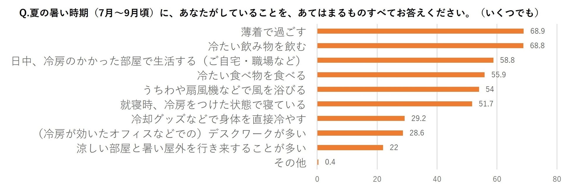夏の暑い時期(7月~9月頃)にしていることとして最も多かった行動は「薄着で過ごす」の68.9%であり、次に「冷たい飲み物を飲む」の68.8%という結果でした。また、半数以上の回答があった行動としては、「日中、冷房のかかった部屋で生活する(ご自宅・職場など)」(58.8%)、「冷たい食べ物を食べる」(55.9%)、「うちわや扇風機などで風を浴びる」(54%)、「就寝時、冷房をつけた状態で寝ている」(51.7%)であることがわかりました。