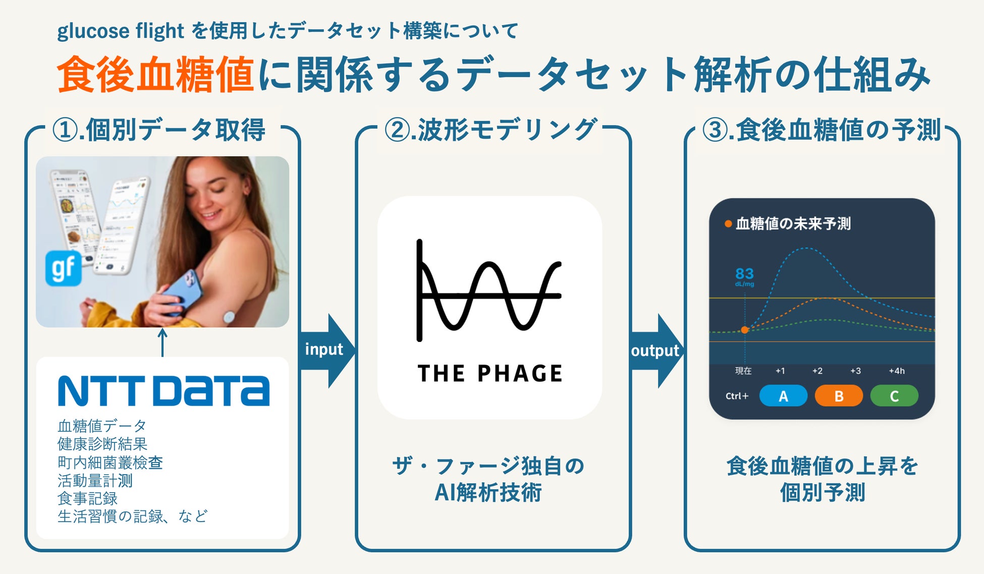 ザ・ファージとNTTデータは、このPoCを通じて、食品メーカーに向けた食品の健康効果を解析するための臨床研究支援事業の事業化に向けた第一歩を踏み出しました。この取り組みでは、ザ・ファージの血糖値解析アプリ「glucose flight(グルコースフライト®️)」やNTTデータのFood&Wellnessプラットフォームを活用し、高品質かつ迅速なデータ収集と解析を行っています。