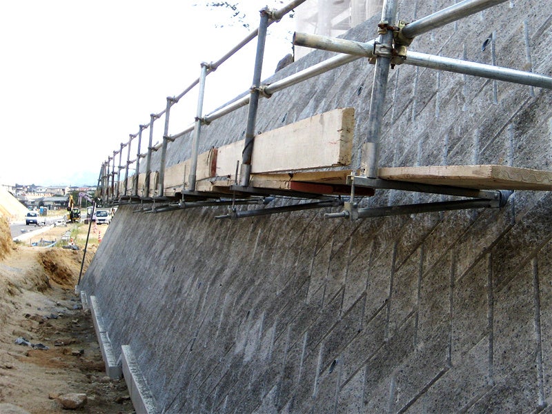 また、足場ブラケットの移設が頻繁に発生する現場や、極力景観を損ねたくない現場、擁壁の底部から足場を組み上げることが出来ない現場など擁壁の点検補修や、最終検査用の足場として最適です。