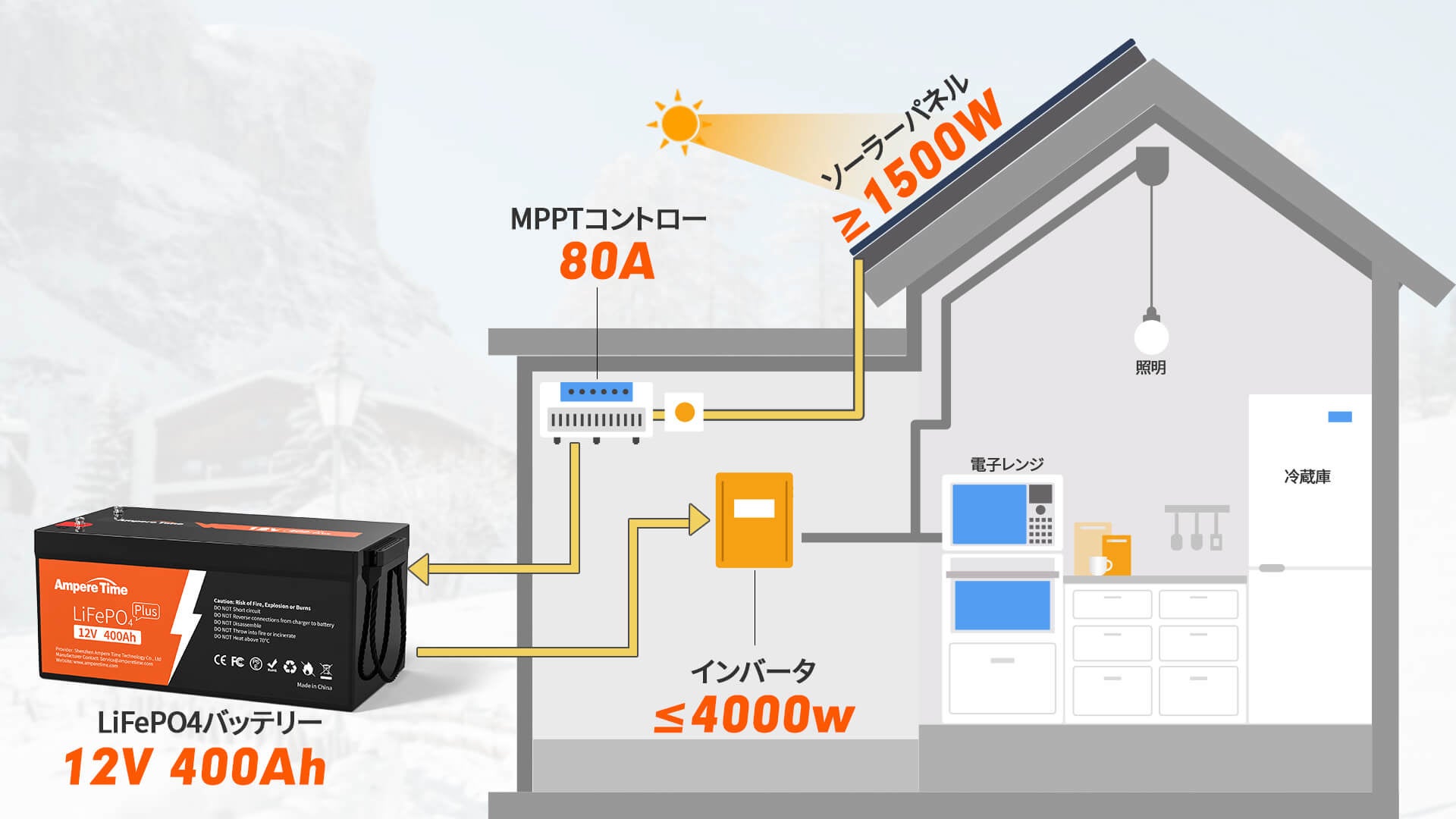 12V400Ahのバッテリーのエネルギーは5120whです。わずか209999円で購入できます。