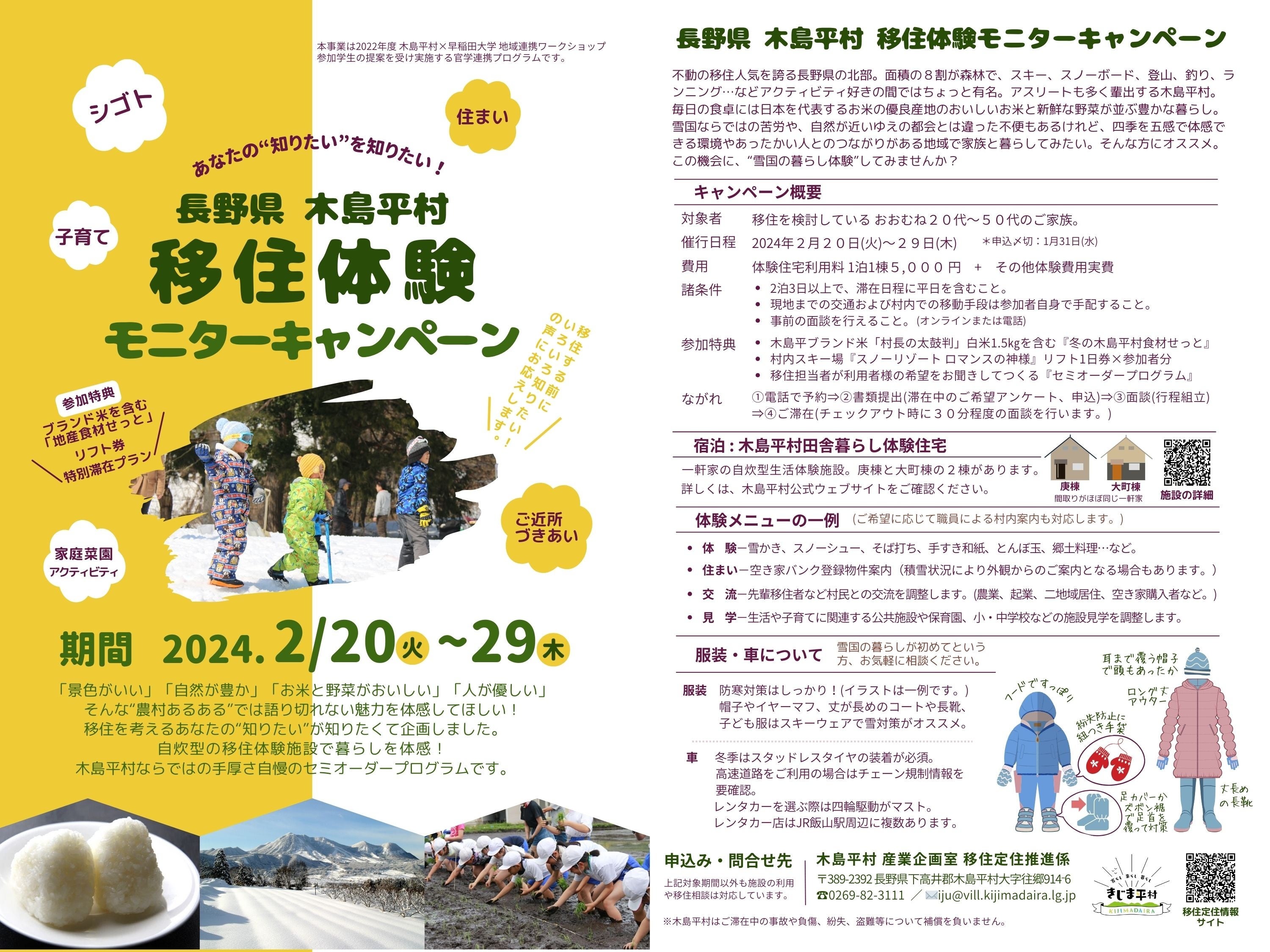 【2024.2.20~29開催】長野県木島平村で「移住体験モニターキャンペーン」を実施します。〜あなたの“知りたい”を知りたい!〜