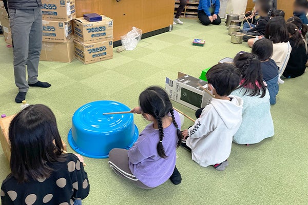 お鍋やタライ、段ボールなどの音も「これは高い音」「こっちは低い音」など、普段は叩けない物を叩くとどんな音がするのか?真剣に聴き分けているのが印象的でした。