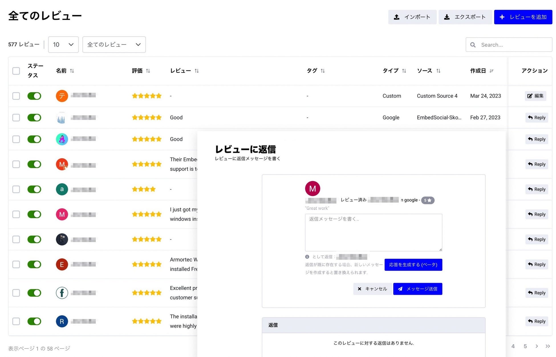 Embedsocialでは、複数のロケーションの口コミ情報を一つの画面で管理することができます。評価順や日付順によるソート、キーワードによる口コミ情報の検索、そして口コミ情報のタグ付けやグルーピングも可能です。従来から、管理画面内から口コミへの返信機能や、テンプレート方式による自動返信機能がありましたが、今回のChat-GPT連携のアップデートにより、これらの機能や利便性が大幅に向上しました。
