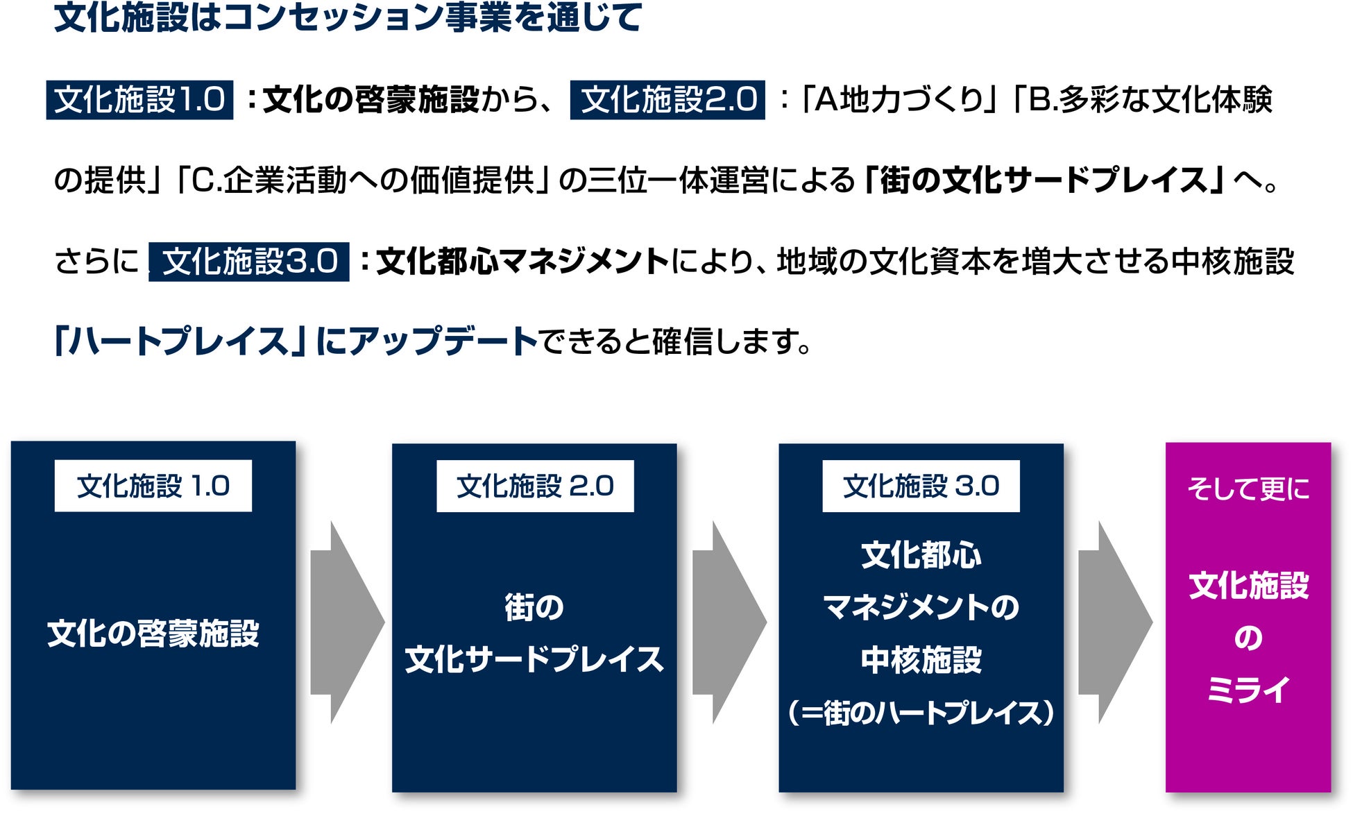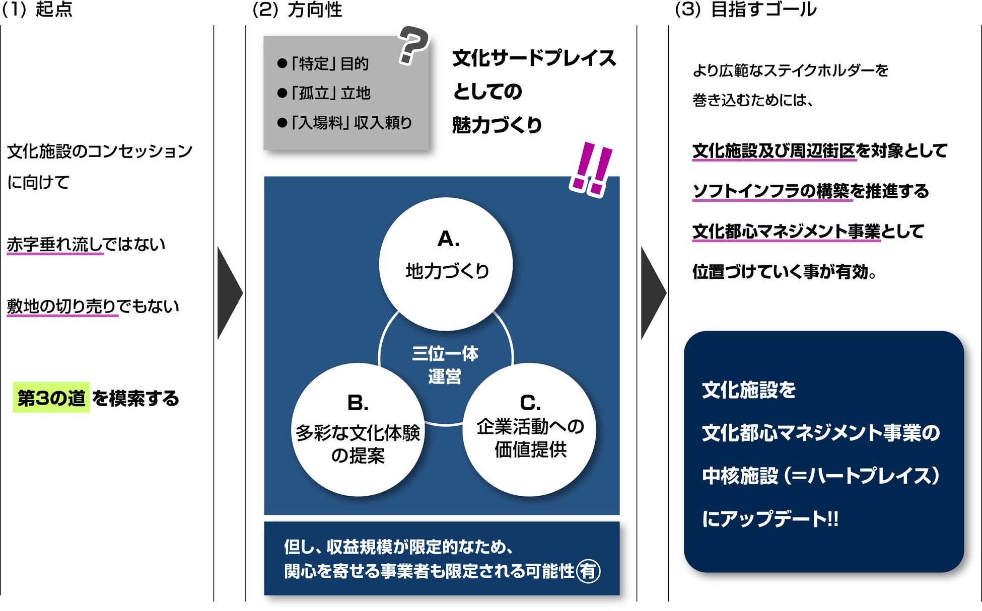 文化施設のコンセッションを実現するために、自治体側が活用条件を整えるとともに、民間企業側にも、その意義と可能性の認識が広がる事を期待します。