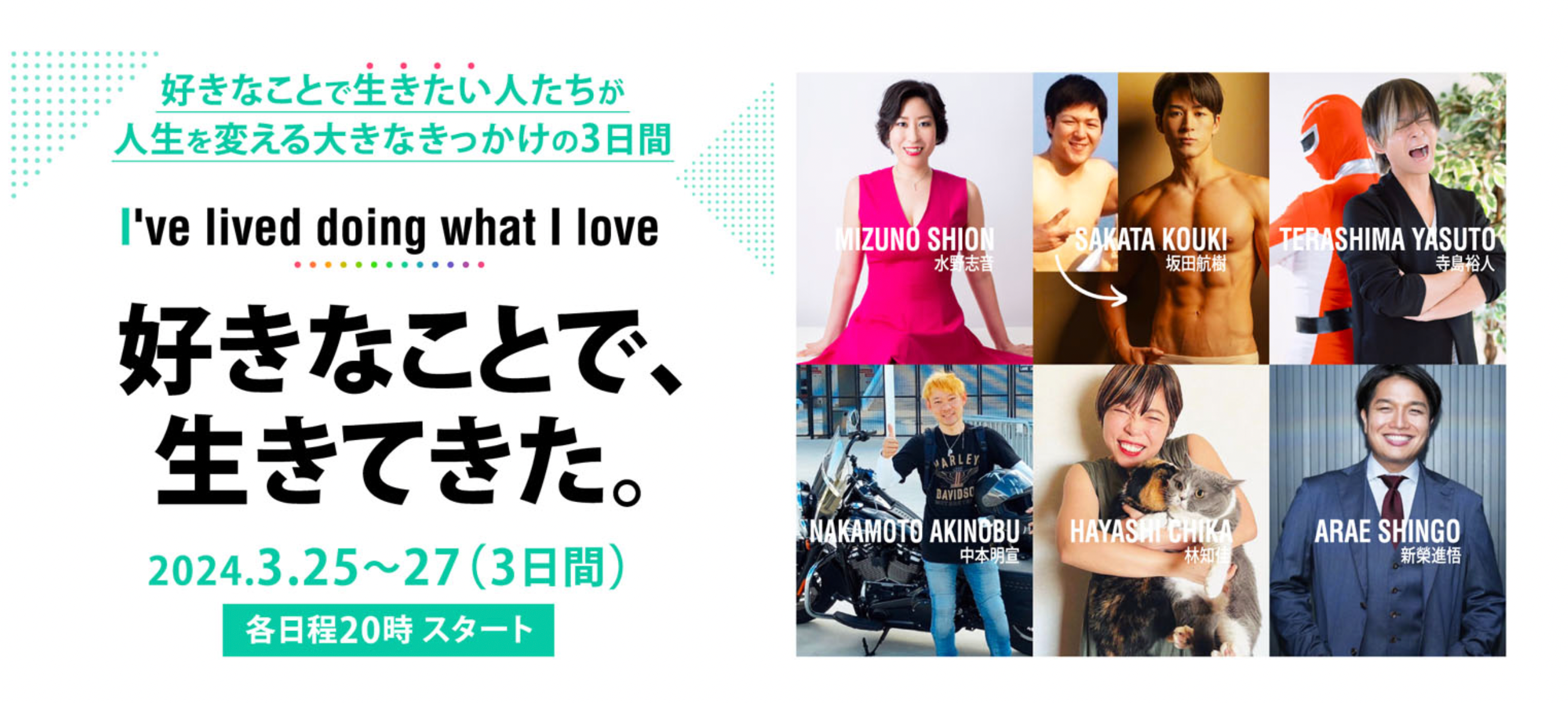 TOLICO株式会社(本社:東京都江東区、代表取締役:新榮進悟 以下、TOLICO)は、2024年3月25日(月)からの3日間、オンラインカンファレンス「好きなことで、生きてきた。」を開催することを決定しました。