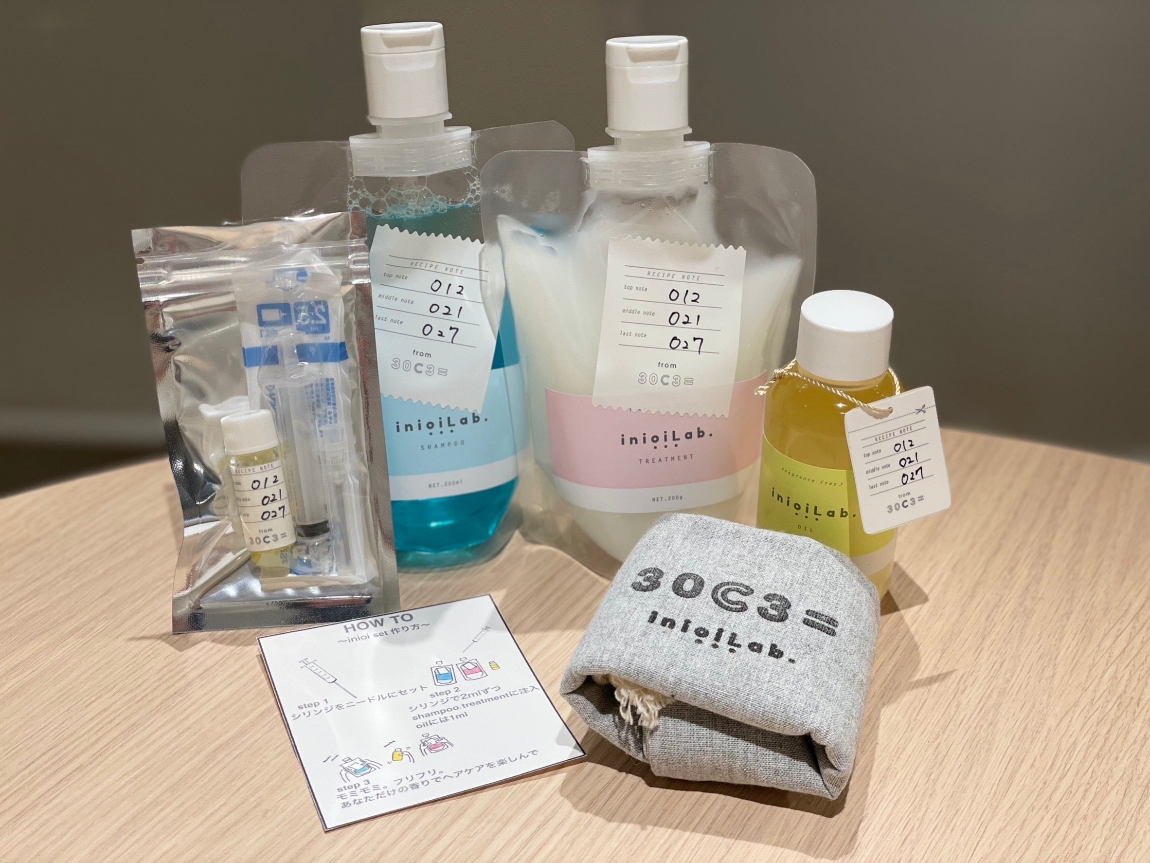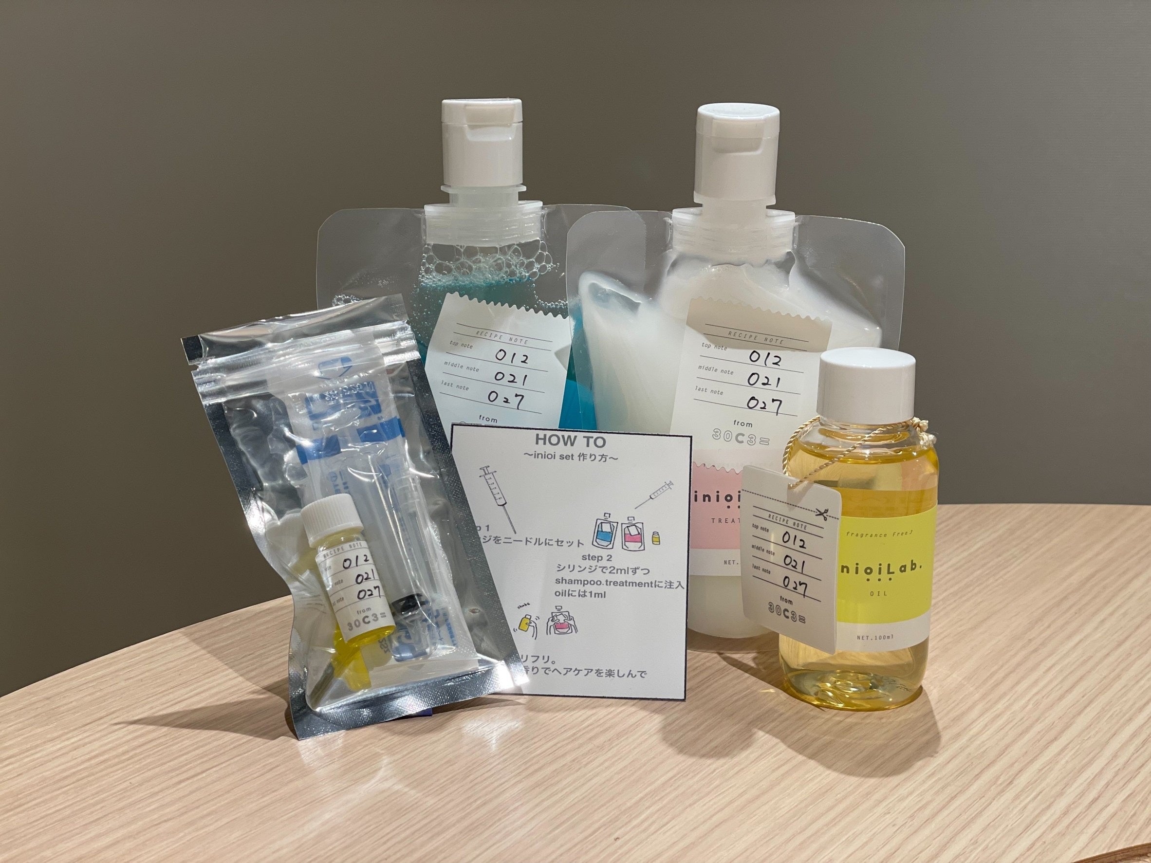 オンラインショップ内で【調合した香り】と【無香料のヘアケア】と【香料を入れる時のキッド】が送られてきて、自宅で香料を注入して使用する。